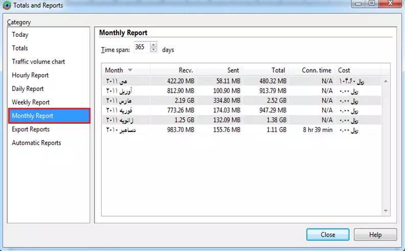 در قسمت Total میتوانید اطلاعات ماهانه و هفتگی را از زمانی که کانتر آن را فعال کردهاید مشاهده کنید. همانطور که در شکل مشاهده میکنید در این قسمت میتوانید کانتر را صفر کنید. به عنوان مثال کاربران از شروع دوره خود میتوانند کانتر این قسمت را صفر کنند تا مقدار استفاده هر دوره را داشته باشند.