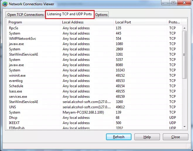 در سربرگ دوم Listing UDP and TCP Ports تمامی برنامههایی که یک پورت، چه برای TCP و چه برای UDP را برای خود رزرو کردهاند نشان داده میشود.
