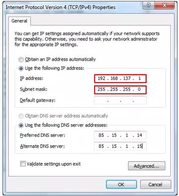 بعد از Share کردن اینترنت بر روی یک کارت شبکه، آی پی ۱۹۲.۱۶۸.۱۳۷.۱ به صورت اتوماتیک بر روی کارت شبکه دیگر شما که مربوط به شبکه داخلی است، تنظیم خواهد شد.