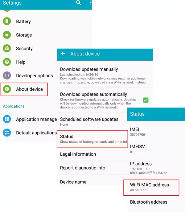 - روی گزینه About سپس Status بزنید. کدی که روبروی گزینه Wi-Fi MAC Address نوشته میشود مک آدرس مربوط به دستگاه اندروید شماست.