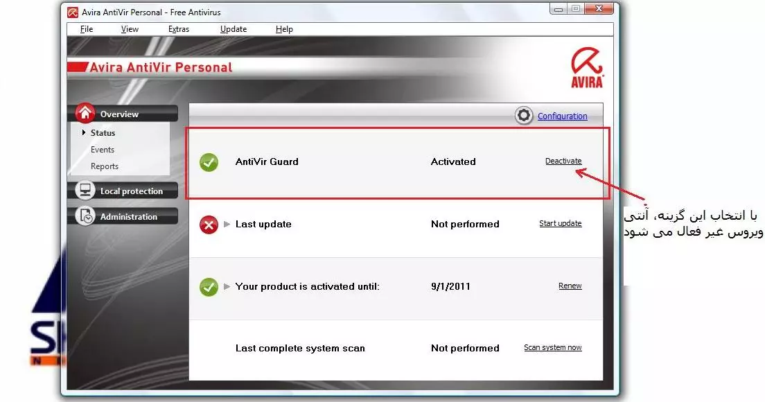 روی آیکون Avira در قسمت Notification Area دوبار کلیک و پس از بازشدن پنجره اصلی Avira روی کاربرگ Overview کلیک کنید. سپس Status را انتخاب کنید، در پنجرهای که مقابل Status باز میشود روی گزینه Deactivate در قسمت AntiVir Guard کلیک کنید.