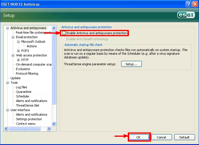حال در پنجره باز شده چک مارک گزینهی Enable Antivirus and Antispyware Protection را غیرفعال و روی گزینه OK کلیک کنید.
