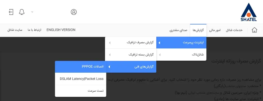 ** لازم به توضیح است که با هر تغییر میبایست برای مدتی خط را مانیتور فرمایید تا از رفع و یا عدم رفع مشکل اطمینان حاصل کنید. با مراجعه به سایت my.shatel.ir و ورود به حساب کاربری خودتان طبق مسیر زیر میتوانید لاگ کانکشن اینترنت خود را بعد از هر تغییر روی خط مشاهده فرمایید و در صورت داشتن کانشکشن مناسب عامل مشکل را طبق تغییرات انجام شده شناسایی فرمایید.